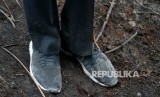 Sepatu Presiden Joko Widodo usai digunakan meninjau penanganan kebakaran hutan dan lahan di Desa Merbau, Kecamatan Bunut, Pelalawan, Riau, Selasa (17/9/2019). (FOTO : Antara/Puspa Perwitasari)