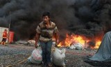 Pekerja mencoba menyelamatkan barang-barang yang belum terbakar saat terjadi kebakaran gudang pengepul plastik bekas di Rawa Kompeni, Tangerang, Banten, Kamis (19/9/2019). (FOTO : Antara/Muhammad Iqbal)