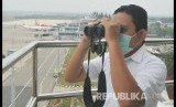 Petugas Air Traffic Control (ATC) melakukan pengamatan visual pesawat udara yang akan lepas landas di Bandara Internasional Minangkabau (BIM), Padangpariaman, Sumatera Barat, Senin (23/9/2019). (FOTO : Antara/Iggoy el Fitra)