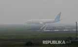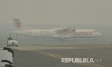 Sebuah pesawat udara bersiap lepas landas di Bandara Sultan Thaha yang diselimuti kabut asap karhutla, Jambi, Senin (23/9/2019). Kota Jambi kembali terpapar kabut asap yang bertambah pekat dalam tiga hari terakhir (FOTO : Antara/Wahdi Septiawan)