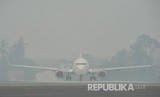 Sebuah pesawat udara mendarat di Bandara Internasional Sultan Iskandar Muda yang diselimuti kabut asap di Blang Bintang, Aceh Besar, Aceh, Senin (23/9/2019). (FOTO : Antara/Irwansyah Putra )