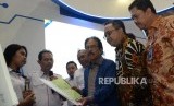 Menteri Agraria dan Tata Ruang Sofyan A Djalil didampingi Direktur PT Bank Tabungan Negara (Persero) Tbk. Andi Nirwoto (dua kanan) dan Budi Satria (kanan) berbicang ketika berkunjung ke both Bank BTN untuk memastikan HT-el (Hak Tanggungan Elektronik) sudah dapat diimplementasikan melalui sistem layanan Bank BTN di Jakarta, Rabu (25/9). (FOTO : Republika/Prayogi)