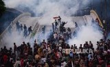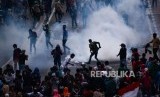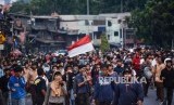 Massa aksi pelajar STM saat terlibat bentrok dengan polisi ketika melakukan aksi unjuk rasa tolak UU KPK hasil revisi dan RKUHP di Jalan Layang Slipi, Petamburan Jakarta, Rabu (25/9/2019). (FOTO : Republika)