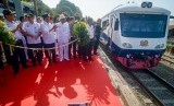 Menteri Perhubungan Budi Karya Sumadi (ketiga kiri) bersama Direktur Utama PT KAI Edi Sukmoro (keempat kiri) menyambut kedatangan kereta istimewa saat peringatan hari ulang tahun PT KAI di Bandung, Jawa Barat, Sabtu (28/9/2019). (FOTO : ANTARA FOTO)