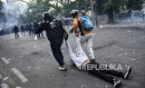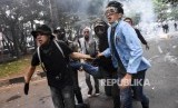 Mahasiswa dan pelajar mengevakuasi rekannya saat aksi unjuk rasa di depan Gedung DPRD Provinsi Jawa Barat, Kota Bandung, Senin (30/9). (FOTO : Abdan Syakura)