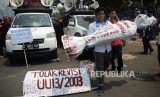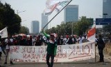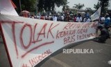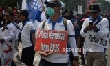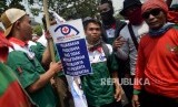 REPUBLIKA.CO.ID, JAKARTA -- Buruh menggelar aksi di kawasan Senayan, Jakarta, Rabu (2/10).