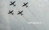 Sejumlah pesawat tempur TNI AU melakukan atraksi saat mengikuti gladi bersih HUT TNI di Taxy Way Echo Pangkalan Udara Halim Perdana Kusuma, Jakarta, Kamis (3/10). (FOTO : Republika/Putra M. Akbar)