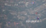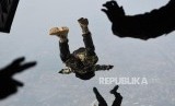 Prajurit TNI melakukan terjun bebas (free fall) dari pesawat udara CN 295 milik Skadron Udara 2 Lanud Halim Perdanakusuma di ketinggian 7000 kaki di atas Lanud Halim Perdanakusuma, Jakarta Timur, Kamis (3/10/2019). (FOTO : M RISYAL HIDAYAT/ANTARA FOTO)