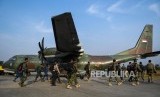 Prajurit TNI dan Polri berjalan menuju pesawat udara CN 295 milik Skadron Udara 2 Lanud Halim Perdanakusuma saat akan mengikuti terjun bebas (free fall) di ketinggian 7000 kaki di atas Lanud Halim Perdanakusuma, Jakarta Timur, Kamis (3/10/2019). (FOTO : M RISYAL HIDAYAT/ANTARA FOTO)