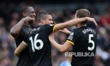 Conor Coady, Ryan Bennett dan Willy Boly merayakan kemenangan pada pertandingan Liga Inggris di Etihad Stadium, Manchester, Ahad (6/10). (FOTO : Carl Recine/Reuters)