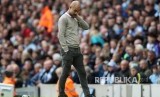 Manajer City Pep Guardiola pada pertandingan Liga Inggris melawan Wolverhampton Wanderer di Etihad Stadium, Manchester, Ahad (6/10). (FOTO : Carl Recine/Reuters)