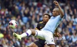 Fernandinho (kanan) dibayangi Adama Traore pada pertandingan Liga Inggris di Etihad Stadium, Manchester, Ahad (6/10). (FOTO : Carl Recine/Reuters)