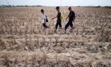 Warga berjalan di sawah yang kering akibat kemarau di Rajeg, Kabupaten Tangerang, Banten, Selasa (8/10/2019). (FOTO : Antara/Fauzan )