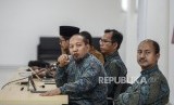 Ketua Islamic Book Fair (IBF) Syahruddin El Fikri bersama Ketua Bidang Khaerudin, Wakil Ketua IBF Husni Kamil, Ketua Bidang Promosi Tatang Sundesyah, Ketua Bidang Acara Abdul Hakim dan Ketua Pra Event Lukman (dari kiri) memberikan paparan saat acara launching Islamic Book Fair di Jakarta, Selasa (8/10). (FOTO : Republika/Putra M. Akbar)