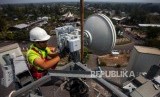 Pekerja melakukan perawatan berkala menara (tower) telekomunikasi milik PT Tower Bersama Infrastructure Tbk (TBIG) di Stadion Maguwoharjo, Depok, Sleman, DI Yogyakarta, Rabu (9/10/2019). (FOTO : Andreas Fitri Atmoko/Antara Foto)