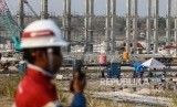 Pekerja beraktivitas di area Proyek Pengembangan Lapangan Gas Unitisasi Jambaran-Tiung Biru (JTB) usai prosesi Tajak Sumur di Desa Bandungrejo, Bojonegoro, Jawa Timur, Rabu (9/10/2019). (FOTO : Rivan Awal Lingga/ANTARA FOTO)