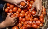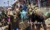 Warga mengambil tomat busuk sebelum mengikuti tradisi Rempug Tarung Adu Tomat (perang tomat) di Kampung Cikareumbi, Kecamatan Lembang, Kabupaten Bandung Barat, Ahad (13/10). (FOTO : Abdan Syakura_Republika)