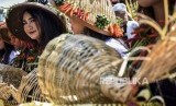 Penari bersiap untuk menampilkan tarian pada tradisi Rempug Tarung Adu Tomat (perang tomat) busuk, di Kampung Cikareumbi, Kecamatan Lembang, Kabupaten Bandung Barat, Ahad (13/10). (FOTO : Abdan Syakura_Republika)