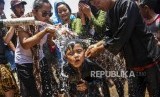 Warga membersihkan tubuhnya menggunakan air usai mengikuti tradisi Rempug Tarung Adu Tomat (perang tomat) busuk, di Kampung Cikareumbi, Kecamatan Lembang, Kabupaten Bandung Barat, Ahad (13/10). (FOTO : Abdan Syakura_Republika)