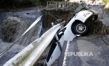 Sebuah mobil terseret air bah di Prefektur Miyagi , Jepang, setelah Topan Hagibis menghantam kota tersebut , Ahad (13/10).. (FOTO : Kyodo News via AP)