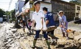 Siswa sekolah dan warga setempat membersihkan jalanan dari lumpur yang terbawa banjir di Marumori, Miyagi prefecture Jepang utara setelah Hagibis menghantam kota tersebut , Ahad (13/10).. (FOTO : Kyodo News via AP)