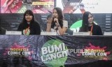 Aktris Pevita Pearce (tengah) memberikan paparan saat peluncuran Komik 'Sri Asih' pada acara Indonesia Comic Con 2019 di Jakarta Convention Center (JCC) Senayan, Jakarta, Ahad (13/10). (FOTO : Republika/Putra M. Akbar)