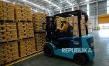 Peresmian Pabrik Sika. Pekerja memindahkan stok mortar di pabrik Sika ke-3 di Cibitung, Bekasi, Jawa Barat, Senin (14/10/2019). (FOTO : Republika/ Wihdan)