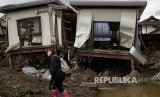 Warga Nagano Jepang saling memberi semangat keoada tetangganya saat membersihkan rumah mereka yang hancur akibat badai Hagibis.. (FOTO : Jae C Hong/AP)