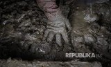 Warga mencari barang yang bisa diselamatkan dari endapan lumpur sisa kerusakan akibat badai Hagibis di Nagano, Jepang, Selasa (15/10). (FOTO : Jae C Hong/AP)