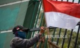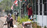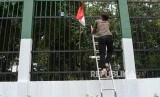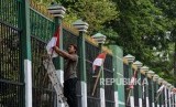 Pekerja mengecat pagar gedung DPR RI di kawasan Senayan, Jalan Gatot Soebroto, Jakarta, Rabu (16/10/2019). (FOTO : Thoudy Badai)