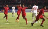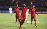 Pesepak bola Indonesia U-19 Amiruddin Bagus Kahfi (tengah) melakukan selebrasi usai mencetak gol ke gawang China U-19 saat laga uji coba di Gelora Bung Tomo, Surabaya, Jawa Timur, Kamis (17/10/2019). (FOTO : ZABUR_KARURU/ANTARA FOTO)