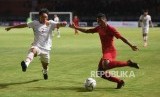 Pesepak bola Indonesia U-19 Muhammad Fajar Fathur Rachman (kanan) menendang bola dan berusaha dihalangi pesepak bola China U-19 Yuhad Chen (kiri) saat laga uji coba di Gelora Bung Tomo, Surabaya, Jawa Timur, Kamis (17/10/2019). (FOTO : ZABUR_KARURU/ANTARA FOTO)