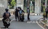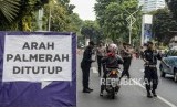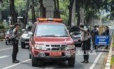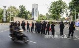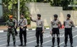 Pasukan gabungan TNI Polri tampak berjaga di Jl Asia Afrika, Jakarta yang termasuk berada di area terdekat dengan Kompleks Gedung Parlemen RI.