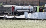 Pertamina menggunakan Vacuum Truck untuk mempermudah proses penyedotan sisa ceceran minyak yang masuk ke area sawah milik warga dan saluran air pasca kebakaran pipa bahan bakar minyak milik Pertamina.