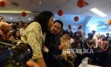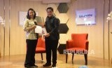 Mantan Menteri BUMN Rini Soemarno memberikan buku laporan kinerja kepada Menteri BUMN Erick Thohir pada acara serah terima jabatan di Kementerian BUMN, Jakarta, Rabu (23/10). (FOTO : Republika/Prayogi)