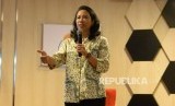 Mantan Menteri BUMN Rini Soemarno memberikan sambutan pada acara serah terima jabatan di Kementerian BUMN, Jakarta, Rabu (23/10). (FOTO : Republika/Prayogi)