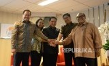 Menteri BUMN Erick Thohir (tengah) berjabat tangan bersama dengan para mantan Menteri BUMN Mustafa Abubakar, Rini Soemarno,Laksamana Sukardi dan Sugiharto (dari kiri) pada acara serah terima jabatan di Kementerian BUMN, Jakarta, Rabu (23/10). (FOTO : Republika/Prayogi)