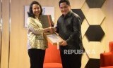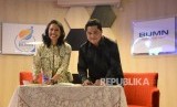 Menteri BUMN Erick Thohir bersama dengan mantan Menteri BUMN Rini Soemarno menandatangani berita acara serah terima jabatan di Kementerian BUMN, Jakarta, Rabu (23/10). (FOTO : Republika/Prayogi)