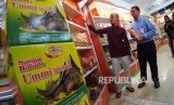 Pengusaha toko oleh-oleh Lukman El Hakim dan Kepala Cabang Mandiri Syariah Bukittinggi Willy Novriwan Saputra bercakap-cakap di Toko “Ummi Aufa Hakim” Bukittinggi, Sumatera Barat, Kamis (24/10). (FOTO : Yogi Ardhi/Republika)
