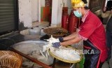 Seorang pekerja menggoreng irisan singkong bahan penganan keripik Sanjai di toko oleh-oleh milik nasabah Bank Syariah Mandiri di Bukittinggi, Kamis (24/10). (FOTO : Yogi Ardhi/Republika)