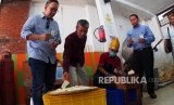 Corporate Secretary Mandiri Syariah Ahmad Reza Pengusaha toko oleh-oleh Lukman El Hakim dan Kepala Cabang Mandiri Syariah Bukittinggi Willy Novriwan Saputra memperhatikan proses pembuatan keripik Sanjai di Toko “Ummi Aufa Hakim” Bukittinggi, Sumatera Barat, Kamis (24/10). (FOTO : Yogi Ardhi/Republika)