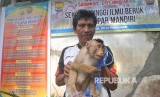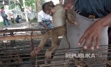 Seekor anak beruk dipilih pembeli untuk dilatih, di Lapak Penjualan Beruk, Pasar Ternak Sungai Sariak. (FOTO : Iggoy El Fitra/Antara)
