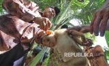 Seekor beruk jantan memetik kelapa di STIB. Beruk jantan terlatih dapat memetik 500 sampai 1000 buah kelapa dalam sehari. (FOTO : Iggoy El Fitra/Antara)