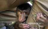 Seekor beruk liar ketakutan saat pertama dibawa ke Sekolah Tinggi Ilmu Beruk (STIB). (FOTO : Iggoy El Fitra/Antara)