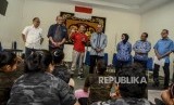 Menteri Pemuda dan Olahraga (Menpora) Zainudin Amali (ketiga kiri) didampingi Ketua Umum PB PABBSI Rosan Perkasa Roeslani (tengah) memberikan motivasi saat meninjau pelatnas cabang olahraga angkat besi di Mess Kweni, Jakarta, Senin (28/10). (FOTO : Republika/Putra M. Akbar)