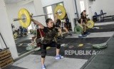 Atlet angkat besi Putri Aulia Andriani (kiri) dan Windy Cantika Aisah saat sesi latihan di Mess Kweni, Jakarta, Senin (28/10). (FOTO : Republika/Putra M. Akbar)