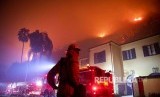 Seorag pria melintas saat api membakar sebuah rumah di Kalifornia, Los Angeles, AS, Senin (28/10) dini hari. (FOTO : Christian Monterossa/AP Photo)
