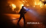 Petugas pemadam berusaha menjinakkan api di Kalifornia, Los Angeles, AS, Senin (28/10) dini hari. (FOTO : Christian Monterossa/AP Photo)