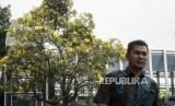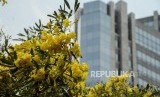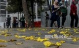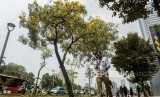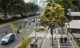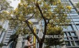 REPUBLIKA.CO.ID, JAKARTA -- Pejalan kaki melintas di dekat pohon Tabebuya di jalan Jenderal Sudirman, Jakarta, Selasa (29/10).