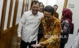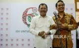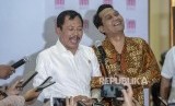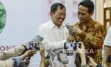 Menteri Kesehatan Terawan Agus Putranto (kiri) bersama Ketua Pengurus Besar Ikatan Dokter Indonesia (PB IDI) Daeng M. Faqih (kanan) usai melakukan pertemuan tertutup di Jakarta, Rabu (30/10). (FOTO : Republika/Putra M. Akbar)